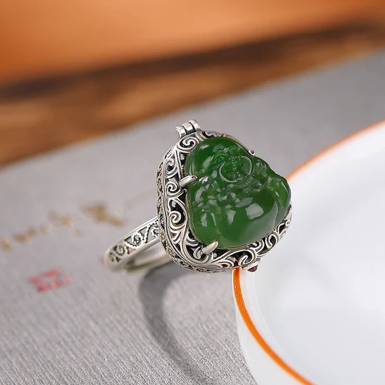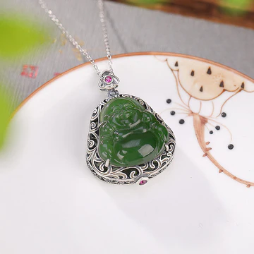Buddha Stones 925 Sterling Silver Natural Hetian Cyan Jade Laugh