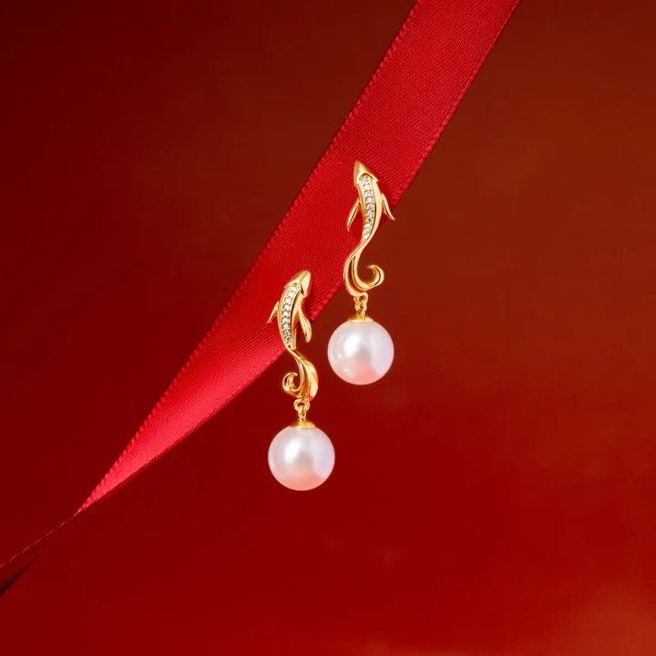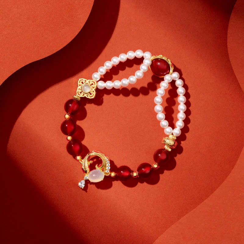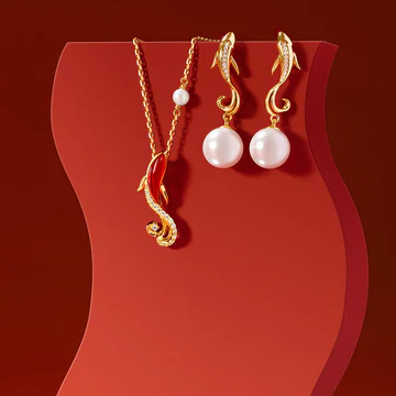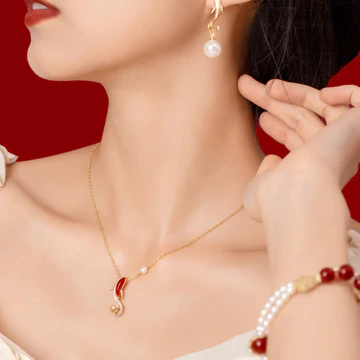 Red Agate Koi Fish set features natural red agate, pearls, and koi fish motifs, symbolizing confidence and good fortune. This set includes a bracelet, necklace pendant, and earrings, all plated with 18K gold on copper. The koi fish design represents perseverance and success, making this set perfect for those seeking to boost their self-assurance and attract positive energy.