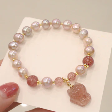 This Buddha Stones bracelet is made with natural pearls and strawberry quartz, known for their healing and positive properties. Each product is handmade with high-quality materials and has a unique positive meaning. The elastic band fits wrists from 14-19cm. Take it off when sleeping or washing, and expect slight variations due to the natural materials.